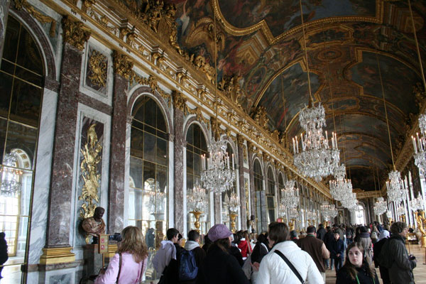Sala Oglinzilor, lunga de 73 de metri, lata de 10,5 metri si inalta de 12,3 metri are pe tavan pictate cateva scene din viata regelui Ludovic al XIV-lea din momentul in care a inceput domnia in anul 1661 si pana in anul 1678 cand a fost pacea din Nijmegen. Regele trecea in fiecare zi prin aceasta sala in drumul sau spre capela si spre apartament. Sala era folosita pentru a gazdui receptiile mari, nuntile regale si intalnirile intre ambasadori.